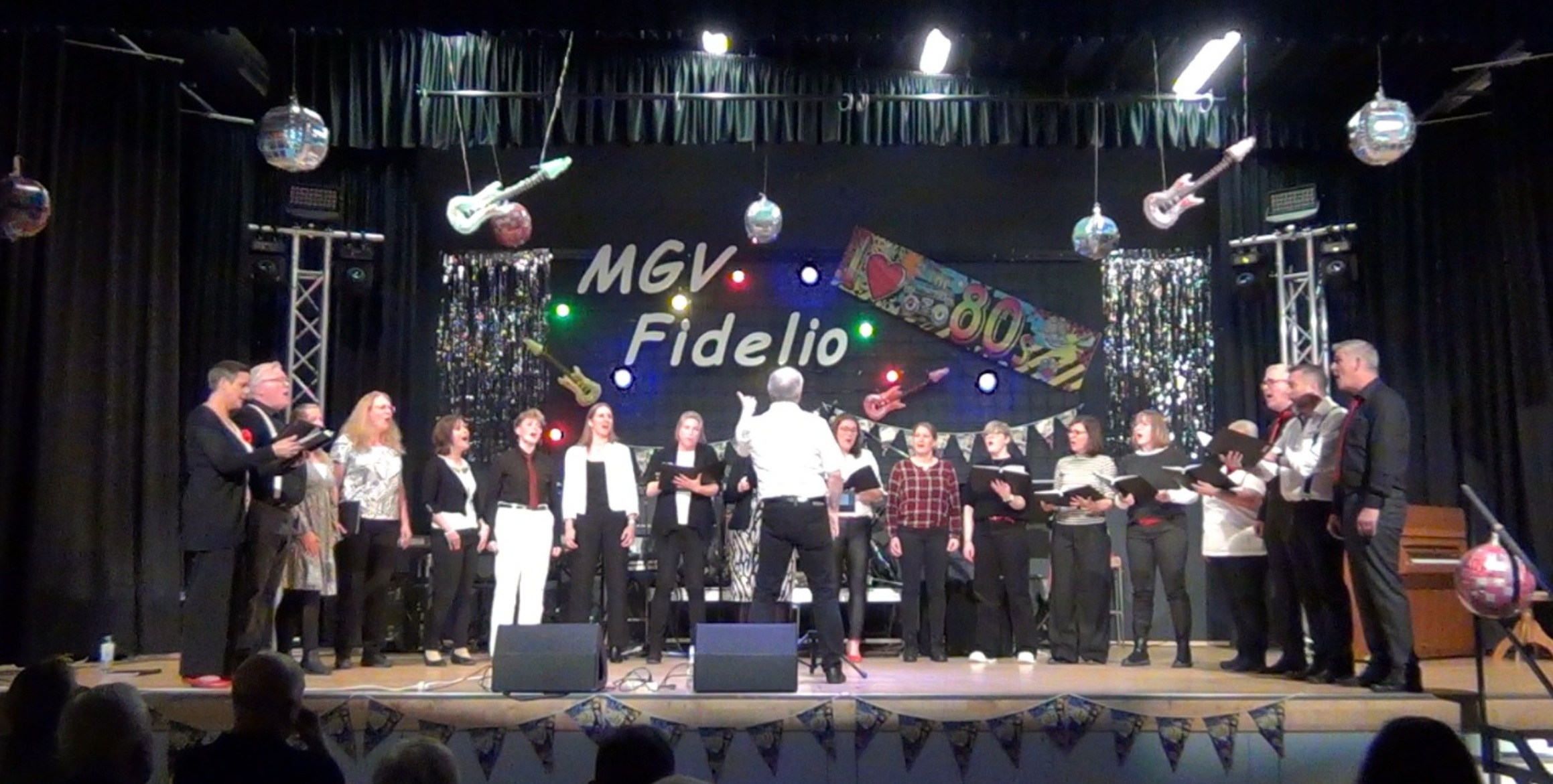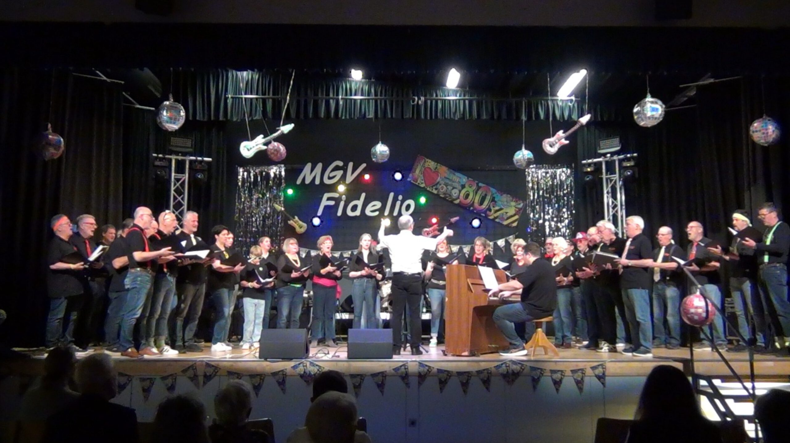 Nach einer kurzen Moderationspause trat als Höhepunkt der eigens für dieses Konzert gebildete Projektchor des MGV „Fidelio“ auf. Rund 50 Sängerinnen und Sänger hatte Dirigent Mario Siry in den vergangenen Wochen intensiv auf diesen Auftritt vorbereitet. Das Publikum durfte sich über vier bekannte Hits der 80er freuen: „Lass uns leben“ (Westernhagen), „Hallelujah“ (Cohen), „That’s What Friends Are For“ (Sager/Bacharach) und „Skandal im Sperrbezirk“ (Sigl) – allesamt in abwechslungsreichen Arrangements, begleitet am Klavier von Christian Brühne. Die Zuhörerinnen und Zuhörer waren sichtlich bewegt und spendeten lang anhaltenden Applaus.